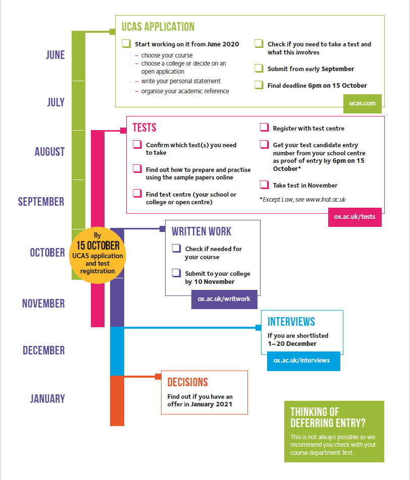 Sur UCAS, la candidature doit être déposée avant  le 15 octobre de l’année N-1. Cela suppose de préparer les documents du dossier de candidature pendant les vacances d’été. Lors du choix du cours, vérifier s’il y un test d’admission préalable. Après la candidature à Cambridge, vous recevrez un mail vous demandant de compléter un questionnaire complémentaire. Si vous visez un College précis, vous pourrez l’indiquer lors de votre candidature, sinon, il est possible d’être candidat sur une filière proposée dans plusieurs Colleges en choisissant la candidature élargie ou “open application“.
