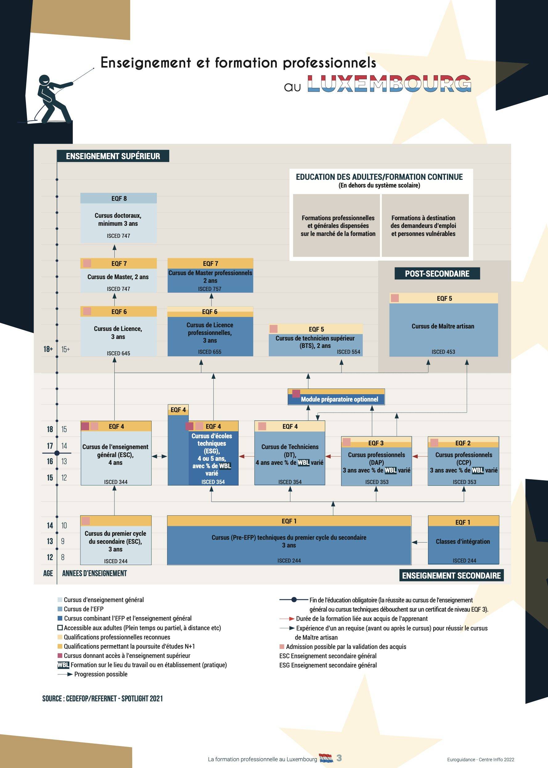 • Le Ministère de l’Education nationale, de l’Enfance et de la Jeunesse qui, à travers le Service de la formation professionnelle coordonne l’apprentissage des adultes, la formation professionnelle et l’encadrement socio-pédagogique des demandeurs d’emploi.